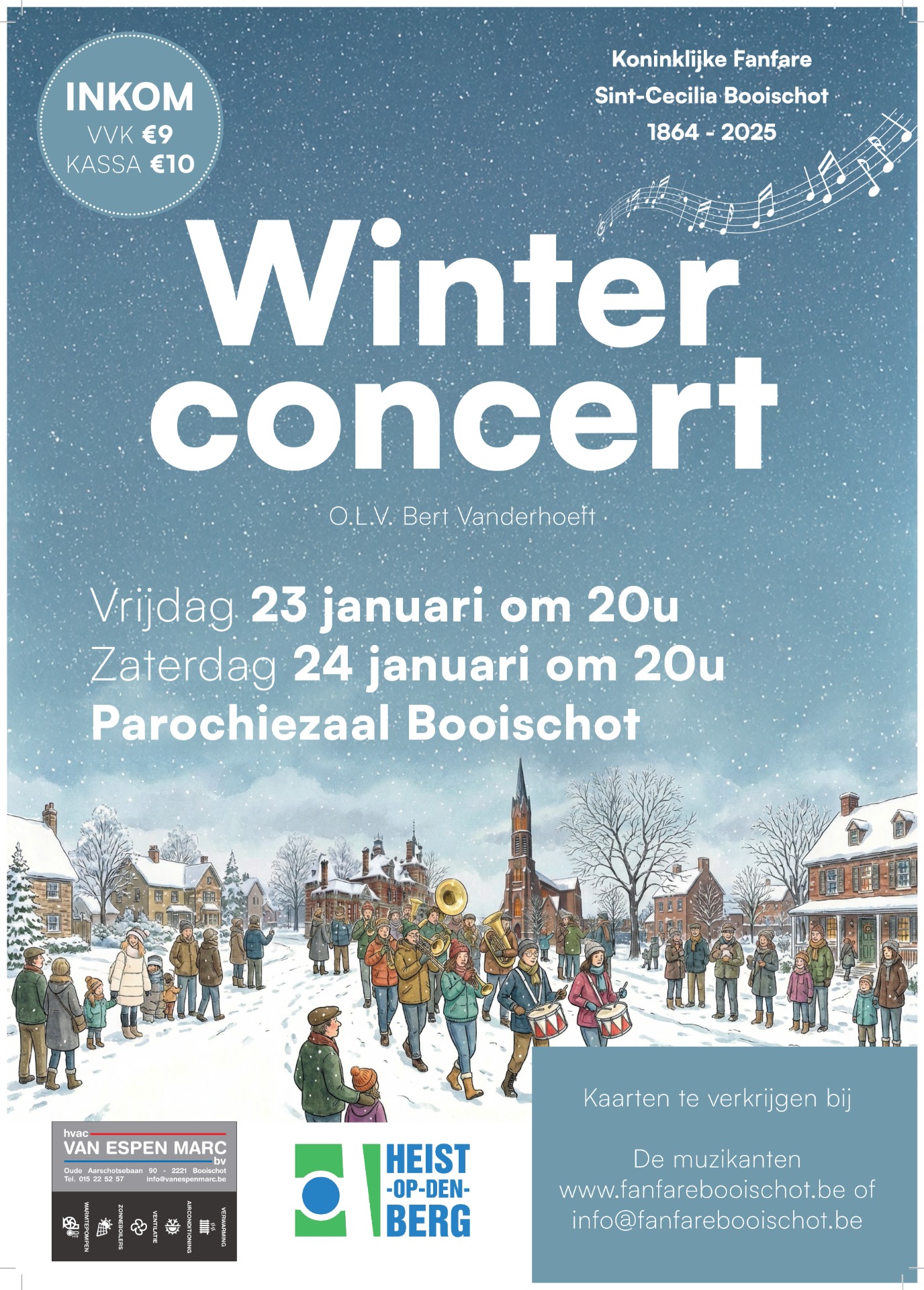 Op vrijdag 23 en zaterdag 24 januari 2026, telkens om 20u, brengen we de parochiezaal van Booischot tot leven met een gevarieerd programma dat zowel liefhebbers van harmonie- en fanfaremuziek als nieuwsgierige luisteraars zal bekoren. Verwacht een sfeervolle mix van krachtige werken, herkenbare melodieën en warme winterse klanken, gebracht met passie en enthousiasme door onze muzikanten.